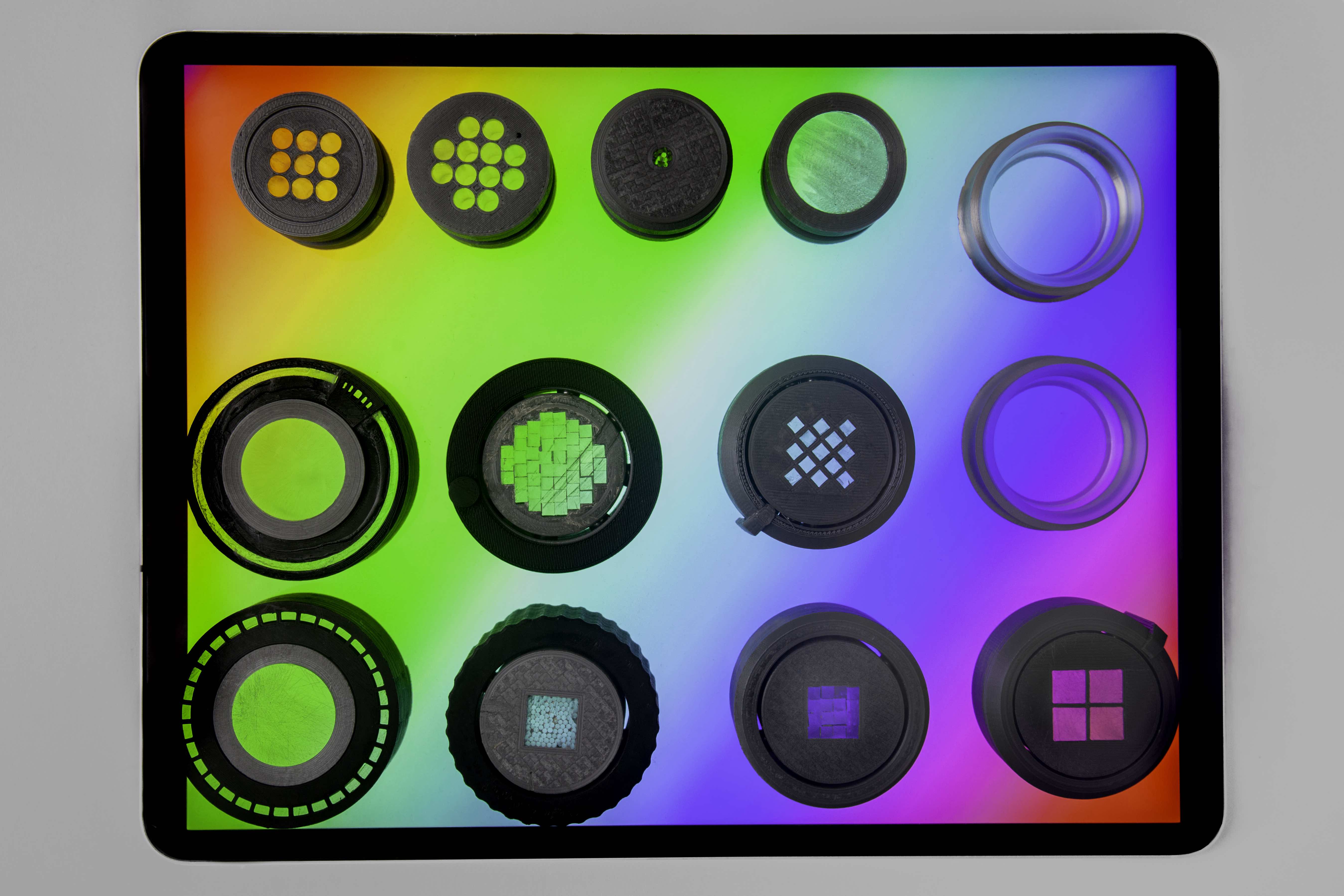 Prototypes printed in conductive and non-conductive filaments and light-guiding acrylic — testing whether a capacitive screen could reliably read rotation from a passive object. Some didn't work. Most almost worked, which was worse.